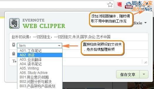 Evernote提供剪辑工具可以添加到chrome浏览器的应用,从而阅读网页时可以随时调用归档待读资料。