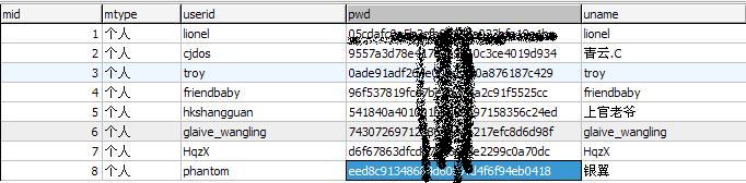 嘿嘿,这个表怎么看着眼熟捏,貌似哪来见过。仔细一看,这不是完整的32位加密了么,然后对比下,发现它的加密方式是去掉前5位和后7位,不亏是天才,一下子就被我研究出来了(只见一个鸡蛋飞过。。。。),因为md5都没法破解,所以,我只能直接修改它数据库内容了,哈哈。够淫荡吧。。。