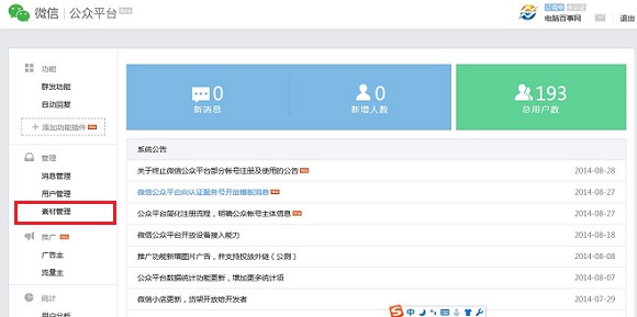 一、首先登陆微信公众平台,进入微信公众平台管理界面后,点击左侧菜单中的“素材管理”,如下示意图所示: