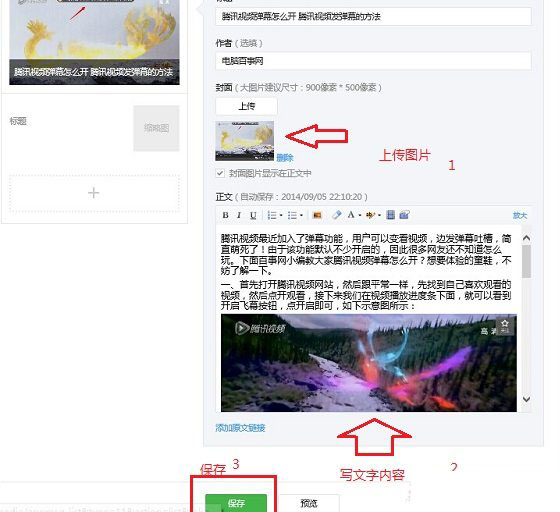三、接下来就可以进入微信公众平台发图文文章界面了,主要是填写文章标题和内容,另外由于是图文消息,必须需要上传一张图片,完成后,点击底部的“保存”即可,如下示意图。