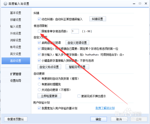 4、在高级设置里找到限制非单字候选项数。