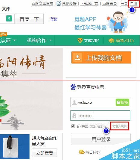 3、如果没有百度帐号,可以点击右上角的注册链接,或者登陆框下边的立即注册先注册一个。