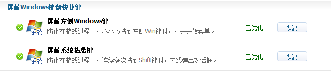 3、进入游戏优化器界面后我们可以看到当前可以为游戏进行优化的选项,其中两项就是屏蔽左侧windows键和屏蔽系统粘滞键,这两个就是造成以上情况的原因了,我们可以把这两个都给屏蔽了。