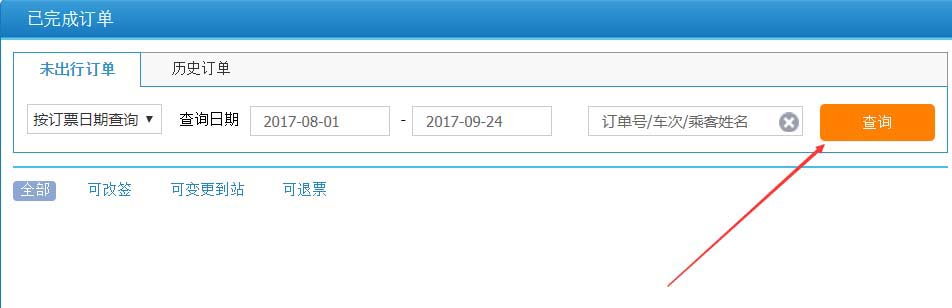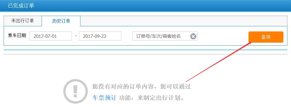 6、点击历史订单可以查询已经出行的订单,也是可以按照时间和订票姓名来查询,如下图所示。
