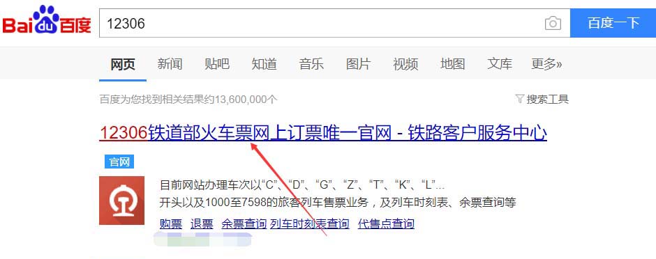 1、打开百度,直接搜索12306,然后点击12306官方网址,如下图所示。