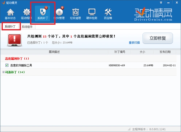 ⒉系统补丁,快速安装。操作系统补丁没打齐?缺少各种.Net、VC运行库致使程序无法运行?驱动精灵可让您的系统安全稳定,功能完备。