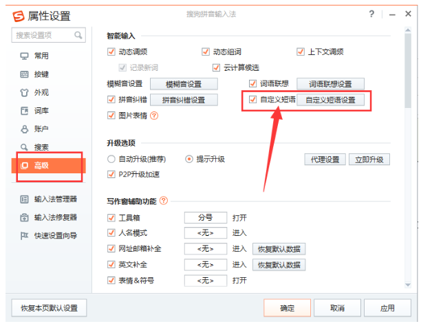 2、在搜狗输入法属性设置中找到“高级”分类,在高级分类里有一个“自定义短语”的功能,打开它,