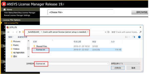 16.再次打开点ANSYS License Management Center,击 "Add a License File" ,并添加_SolidSQUAD_\“Crack with server license (server setup is needed)目录的的许可证文件“License.txt”