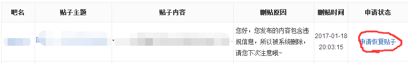 3、系统删帖这里,如果你确定你的帖子没有违反规定,可以点右边的“申请恢复帖子”,提交人工申诉,审核通过之后就能恢复。理由像我这样稍微填一下就可以了,字数要满20个。一般需要等待一两天,据说超级会员(感觉度娘在挖空心思引诱我们开会员)的会优先处理。
