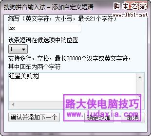 比如“红星美凯龙”,在上面输入“hx”,下面输入“红星美凯龙”,点击确认添加即可。添加成功后,在使用搜狗输入法时,输入“hx”,即可出现“红星美凯龙”,是不是方便了许多啊!
