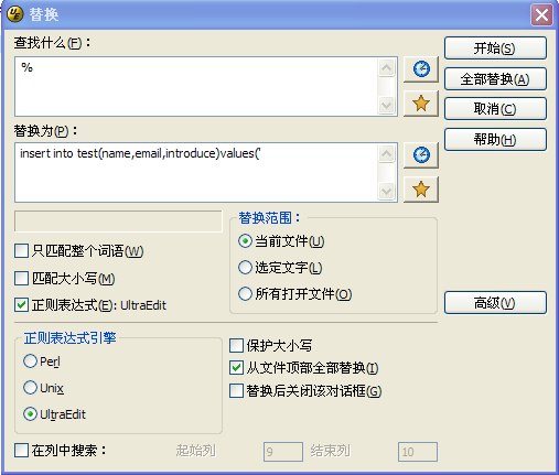 3、 在每行的最前面增加:insert into test(name,email,introduce)values(‘,在UltraEdit正则中,%是表示行首,如下图: