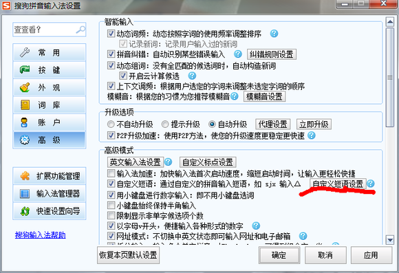 就会跳出这么一个框,点击高级里面的自定义短语设置