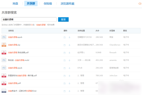 加入共享群之后,就可以在搜索框中输入自己想要搜索的资源名称,点击搜索。搜索结果如图。