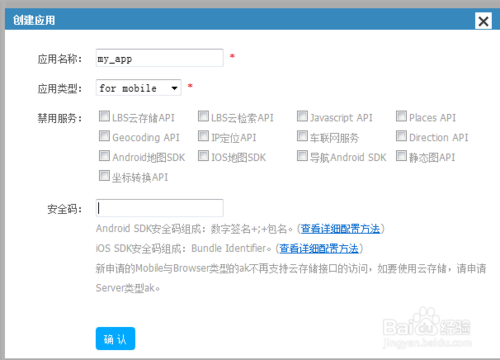 6、然后复制在安全码里面,+;+包名,这里的包名要与你程序中的包名所一致。到这里基本就大功告成了,确定之后开始你的开发之路吧。