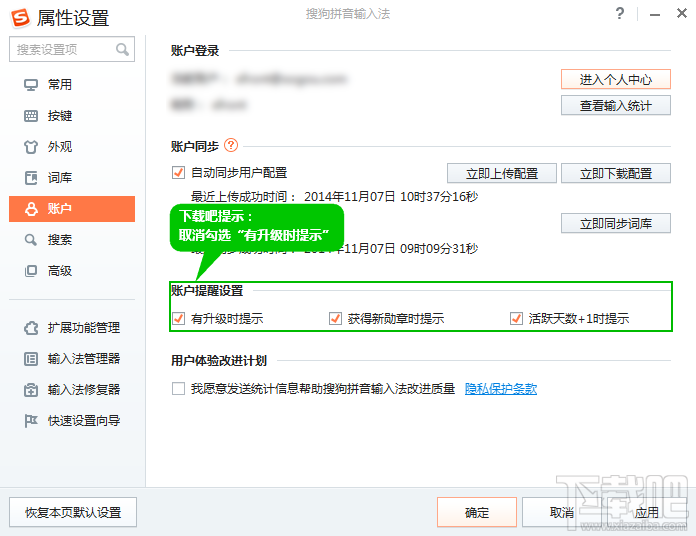 搜狗输入法在有新版本时会自动弹出一个升级提示窗口,但很多时候一个小版本更新根本不值得我们去更新,如果你又不想忍受升级提示的打扰,就跟下载吧来关闭搜狗输入法的升级提示吧。