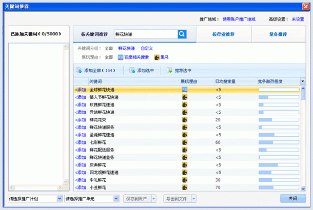 (3)关键词列表-该列表中列出了所有推荐词,可点击“添加全部”将给出的关键词添加至左侧的“关键词添加栏”中,或在关键词列表中选择部分关键词后点击“添加选中”添加至左侧,或直接点击关键词前的“添加”链接进行添加;如需要系统针对已选中的关键词进行推荐,可在选中该关键词后点击“推荐选中”,则系统将根据选中的推荐词重新进行推荐。所有推荐的关键词都拥有“展现理由”,“日均搜索量”,“竞争激烈程度”三个维度帮助您全方面地了解相关信息,您可以通过点击相应栏目进行排序