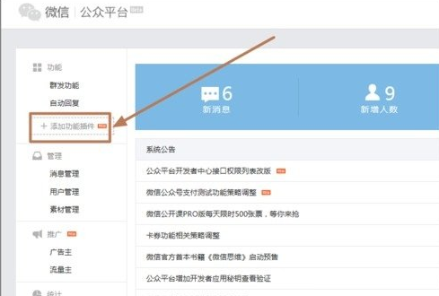 2.进入公众平台管理界面,选择:“增加功能插件”点击打开。