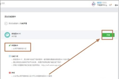4.弹出微信连Wi-Fi这个功能插件的详细说明界面,对插件进行了功能介绍,申请条件,声明等,点击开通按钮,申请开通启用插件,同其它插件一样,只要启用了,则可以返回平台中使用。