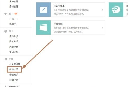 6.在公众平台主界面,点击设置下面的“微信认证”进行身份认证。