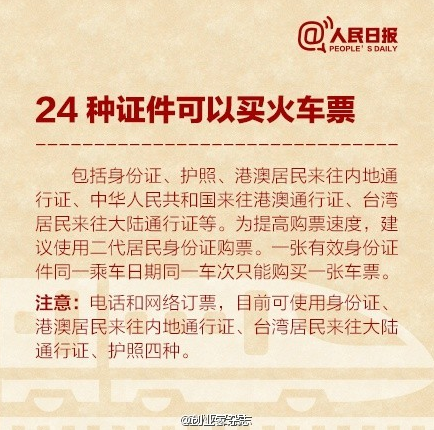 包括身份证、护照、港澳居民来往内地通行证、中华人民共和国来往港澳通行证、台湾居民来往大陆通行证、大陆居民往来台湾通行证等。为提高购票速度,建议使用二代居民身份证购票。一张有效身份证件同一乘车日期同一车次只能购买一张车票。
