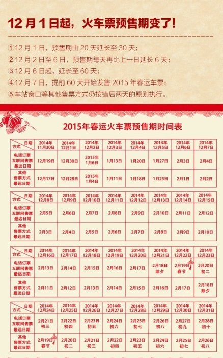 从12月1日起,铁路互联网售票、电话订票的预售期将由目前的20天逐步延长至60天。而从12月21日起,学生可以通过互联网、电话、窗口、自动售票机等各个渠道购买2015年3月15日之前的学生票,这意味着届时学生票最多能提前84天购买。以上的购票攻略大家学到了吗?