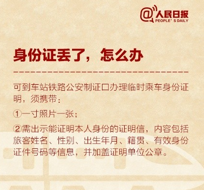 可到车站铁路公安制证口办理临时乘车身份证明,需携带:一寸照片一张;能证明本人身份的证明信,内容包括旅客姓名、性别、出生年月、籍贯、有效身份证件号码等信息,并加盖证明单位公章。