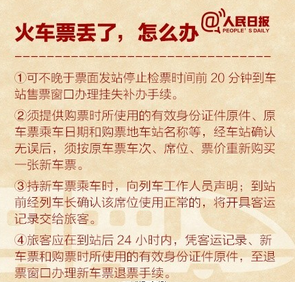 在不晚于票面发站停止检查时间前20分钟到车站售票窗口办理挂失补办手续;
