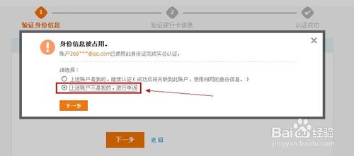 选择“上述账户不是我的,进行申诉”,如果这个账户是你的,建议你选择第一条,因为一旦身份证被占用申诉成功,之前实名认证的账户将被冻结!!!再次强调一下。