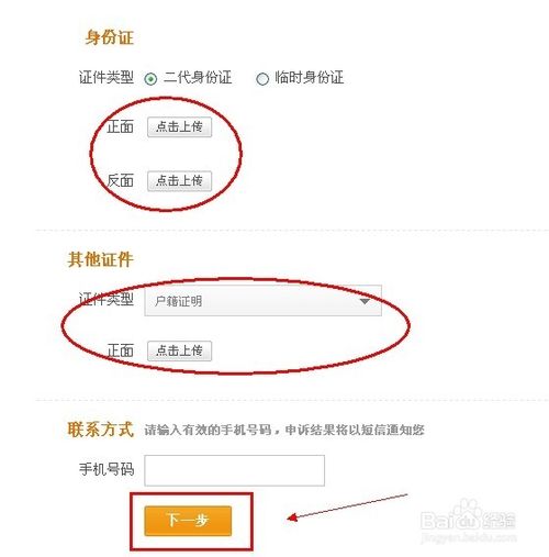 第二步的时候需要注意了,你首先要上传自己的身份证正反面,其他证件是可以选择的,可以选择“户口本”、“户籍信息”、“市民卡”等等,可选择的类型有7 8种。大家上传完之后点击“下一步”