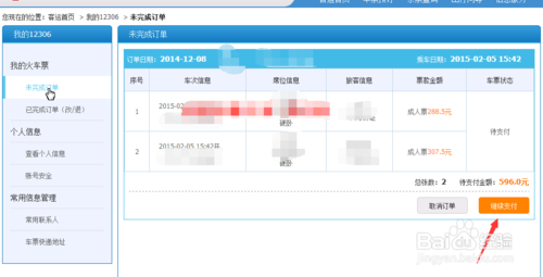 2、把我的12306帐号主页切换到未完成的订单;此时可以看到刚订购的火车票信息;点右下角的继续支付;