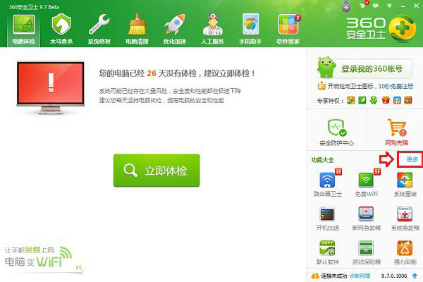 1、首先在电脑中打开360安全卫士,然后在右下角的“功能大全”中,看看有没有【流量防火墙】选项,如果没有,则点击后面的【更多】,如下图所示。