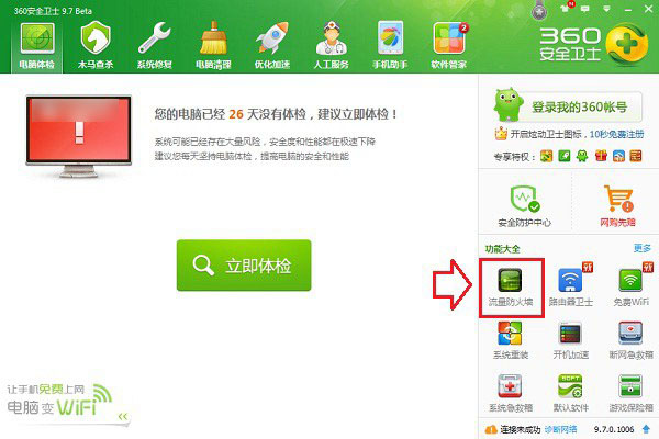3、添加完成后,我们返回360安全卫士主界面,就可以看到【流量防火墙】选项了,我们点击打开,如下图所示。
