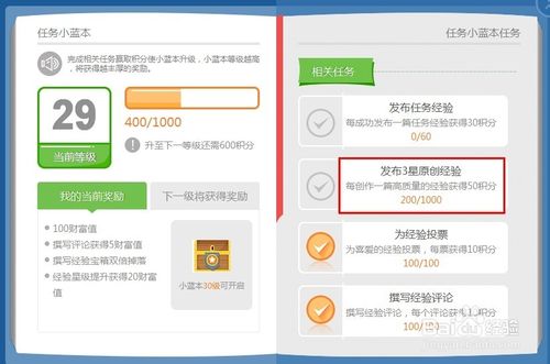 1、首先我们观察一下小蓝本,小蓝本每写一篇三星原创经验可以获得50的积分,天使以自己的小蓝本为例,现在要升级30级,需要写20篇原创经验和投票、评论各10次