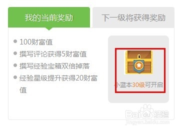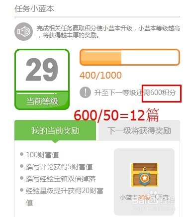 2、所以我们计划好,刚好写够相应的数量经验,升级之后开了相应级别宝箱之后再发布。怎么说呢,就是比如你现在离30级还差50积分,那么你就写一篇3星原创经验就可以了,等着审核通过之后,小蓝本升级之后再发布下一篇经验