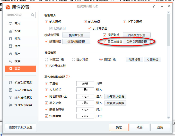 2、然后用鼠标左键单击“高级”按钮,勾选“自定义短语”,单击“自定义短语设置”