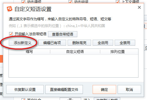 3、之后弹出自定义短语设置,鼠标左键单击“添加新定义”
