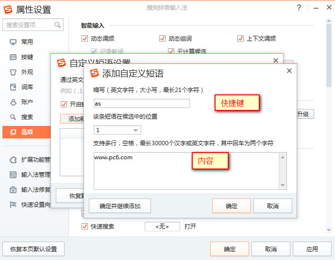 4、我们需要设置短语的快捷键,参照下图,建议使用组合键,避免和其他短语快捷键出现冲突;同时需要设置短语的排序,此处排序应用在输入法输入结果的排序;最后设置相应的快捷短语