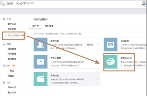 2.进入公众平台管理界面,选择:“增加功能插件”点击打开。