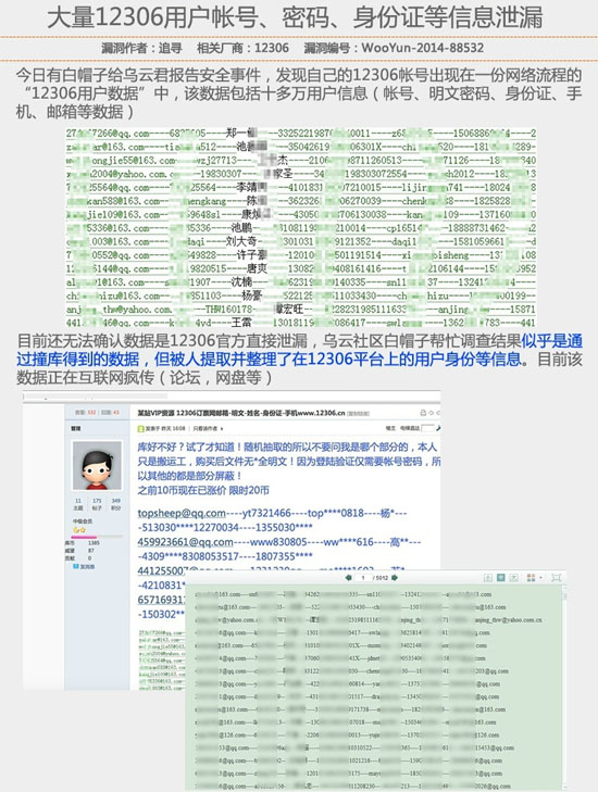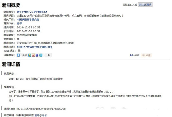 乌云漏洞平台:大量12306用户数据在互联网上传播售卖,包括用户账号、明文密码、身份证、邮箱等。目前已知公开传播的数据库涉及用户数约14万,尚不清楚是否有更多用户数据泄露。请12306用户注意修改密码,如有其他重要账号使用了相同的注册邮箱和密码,应一并修改。