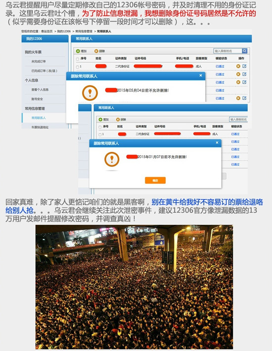 @乌云-漏洞报告平台:“真相在这里!网上正流传一份12306用户帐号、密码等敏感数据,抽查几个帐号验证确实可登录。目前通过白帽子分析,数据疑似黑客撞库后整理得到而并非12306直接泄漏,请用户及时修改密码同时慎用抢票工具。这数据如果被黄牛拿到,把我们辛苦订的票退掉倒腾给别人怎么办”