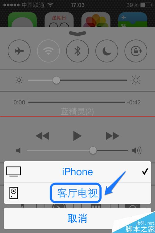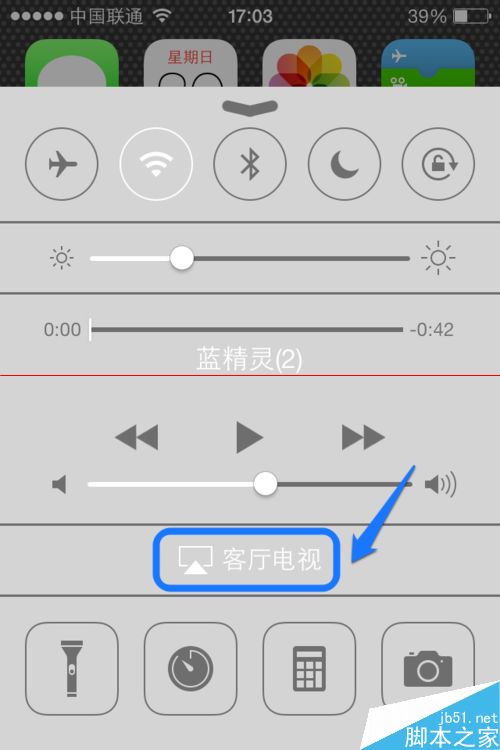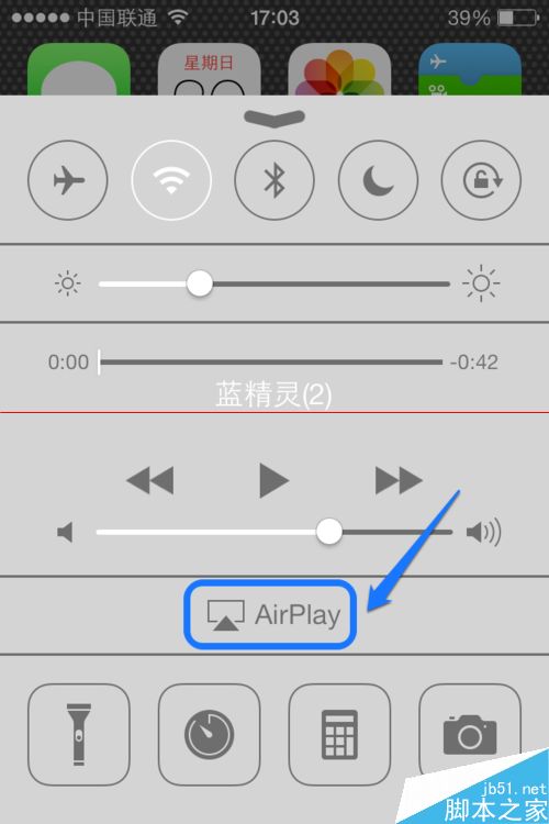 1、当 iPhone 与小米电视都连接在同一个无线局域网时,iPhone 会自动检测到小米电视的 Airplay 功能。这里以当前最新的 iOS7 系统为例,在 iPhone 主屏上用手指向上滑动,打开“控制中心”界面,如图所示