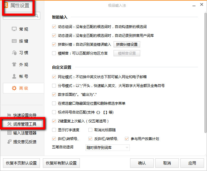 第一步:我们先打开“属性设置”,然后找到“词库管理工具”