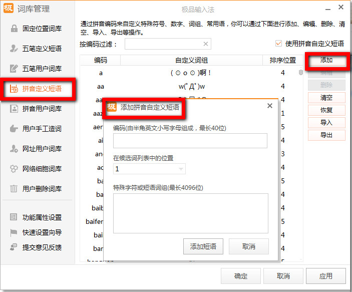 第四、手动造词和自定义短语: