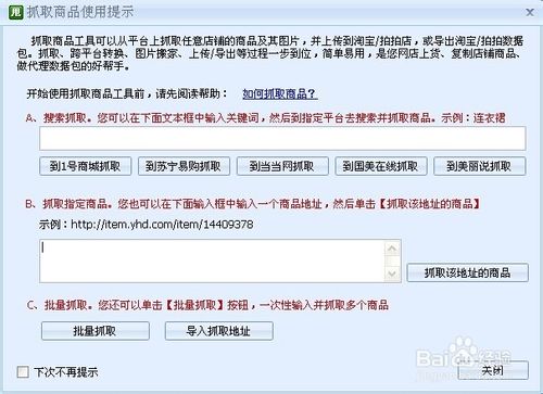 11、除抓取美丽说平台的商品,还可一键抓取拍拍、淘宝、JD、国美、苏宁等等大型网上商城平台中任意的商品,若需要抓取其他平台商品,可参考其他抓取教程。