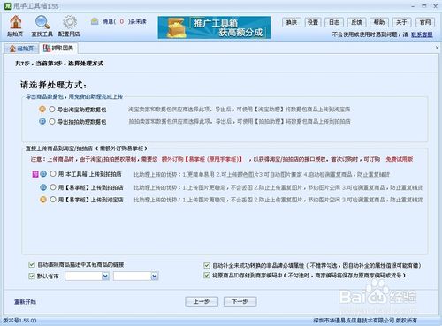4、在此步骤,在第一步时配置过网店的朋友请选择页面下方的【上传淘宝店】或者【上传拍拍店】;没有配置过的朋友请导出商品数据包,以下操作基本一致;