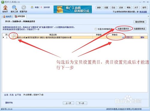 5、勾选所属类目相同的商品一键批量设置好匹配的类目,再进行下一步,转换成功后的类目可显示在【转换后】下方显示,注意类目一定要设置正确