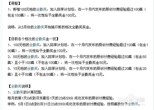 7、除此以外,如果写的经验量多质优,每月还会额外获得100元、50元、15元不等的全勤奖励;
