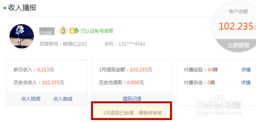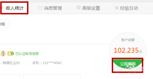 1、首先登陆我们的百度账号,进入我们的百度经验,然后在“收入统计”中,底下有个圆圈的“账户余额”,上面的“立即提现”是灰色的,其实是因为提现只能在“每月1号至20号可申请提现”