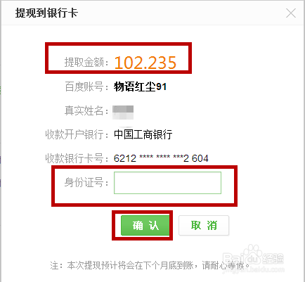 3、这里我们要填写的就是你的“提取金额”和身份证号,其他的信息都是我们之前认证账号的时候认证号的,这里银行账号在之前认证的时候一定要仔细核对,因为这里是不会全部显示的,信息填好后,点击下方的“确认”
