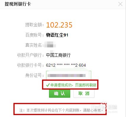 7、申请成功后,我们还需要等待打款到我们账户这里第四步附带的图片最底下的提示告诉我们提现到账的时间,以小编上图为例,1.4号申请,大概在下月底,即2月底到账,所以大家需要耐心等待。